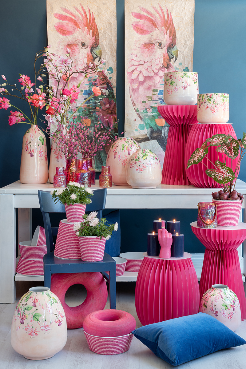 Notre gamme à la mode comprend un large éventail de céramiques, de verres, de fleurs en soie, de décorations, de bois et de paniers, d’objets exotiques, de métaux, de bougies, d’intérieurs et plus encore”.